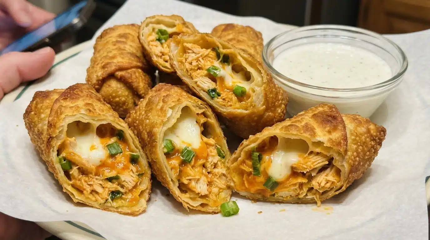 Buffalo Chicken Egg Rolls are crunchy on the outside and spicy and cheesy on the inside. They are great as a snack, party food, or quick dinner. If you like quick chicken twists, try this easy idea and also check a similar warm dish like easy chicken pot pie with crescent rolls for more comfort food options.