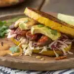 Now comes the fun part—assembling your Oaxacan plantain sandwich! Start by placing a fried plantain slice on a plate. Layer it with a generous amount of cooked chorizo, followed by fresh toppings like shredded cabbage, avocado slices, and a sprinkle of cilantro.