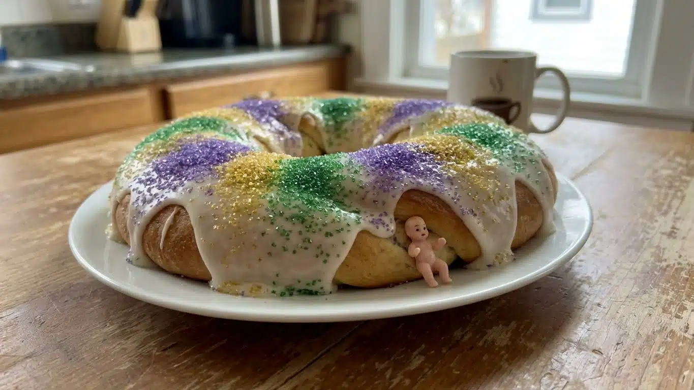 This Traditional King Cake Recipe for Mardi Gras makes a soft, sweet ring bread with cream cheese filling and bright icing. It's perfect for parties and Mardi Gras day.