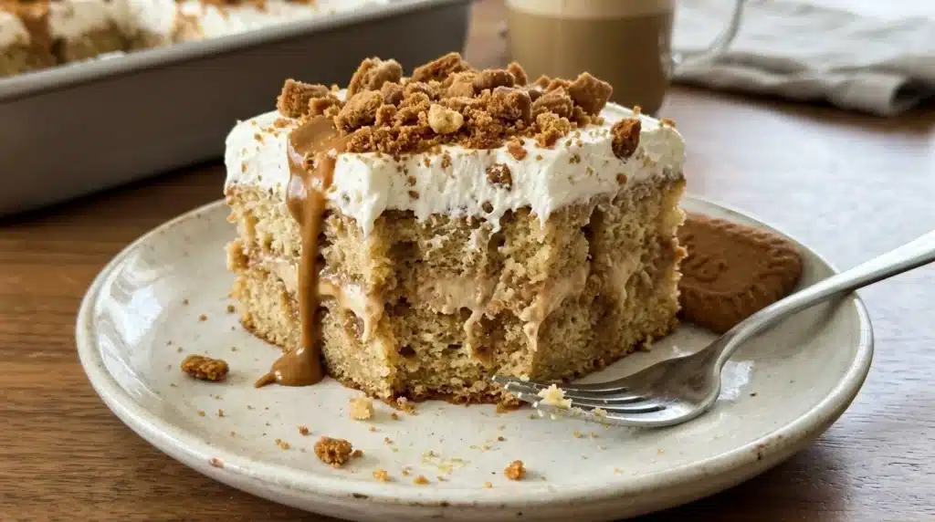 A deliciously moist vanilla cake infused with sweet Biscoff flavors and topped with whipped cream and crushed cookies, perfect for any gathering.